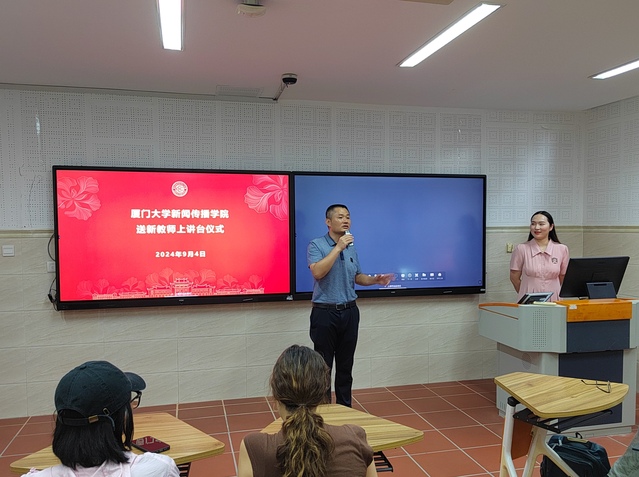 9月4日下午,在囊萤楼106教室,《出版与数字出版概论》课程正式上课之前,新闻传播学院为首次登上讲台的新闻学系年轻教师王嘉昀举办了简单而又正式的仪式。仪式由院党委书记曾铮主持。院长林升栋、院党委副书记黄辉、...