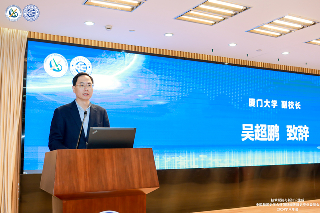 厦门大学党委常委、副校长吴超鹏致辞。他向出席年会的来宾表示热烈欢迎,向长期关心和支持厦门大学新闻传播学科发展的各界朋友们表示感谢。他鼓励与会者畅所欲言、交流思想,共同推动外国新闻史研究的发展,为增进文明交流互鉴、增强中华文明传播力影响力贡献智慧。
