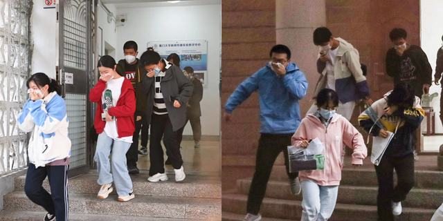 模拟的着火点浓烟弥漫,消防警报随即响起。负责疏散引导工作人员第一时间到达出口各点位,指挥楼内师生保持冷静,用手绢(湿纸巾)紧捂口鼻、弯腰小跑,沿各楼逃生通道有序撤离至新闻楼南面广场空旷地带。
