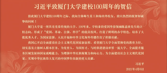 4月6日,厦门大学迎来百年华诞。习近平总书记致厦门大学建校100周年的贺信,充分肯定了厦门大学建校100年所做的贡献,指明了学校新百年发展方向,让每一个厦大人倍感豪情万丈、倍感振奋万分、倍感重任万钧。