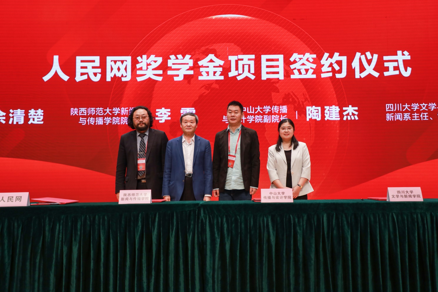 开幕式及主论坛的最后一项议程是人民网奖学金项目新增院校启动仪式。此次新增的院校包括陕西师范大学新闻与传播学院、中山大学传播与设计学院、四川大学文学与新闻学院。陕西师范大学新闻与传播学院院长李震作为新增院校领导代表致辞。人民网总编辑、余清楚院长与三位学院代表进行了签约仪式。开幕式及主论坛到此圆满成功。