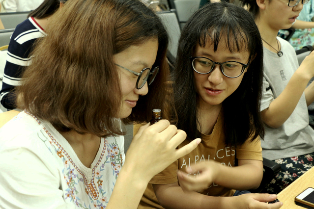 为了让同学们更好地了解芳香疗法,莫老师细致地介绍了薰衣草、天竺葵、依兰依兰等不同种类精油的熏香作用、生理疗效、心灵疗效、相配精油和注意事项等,让现场的同学们亲自体验二十余种不同的精油香气,同学们记录下自己的不同感受,并与老师进行了深入交流。在这之后,莫老师又一步步地教给同学们如何用呼吸法调节状态。