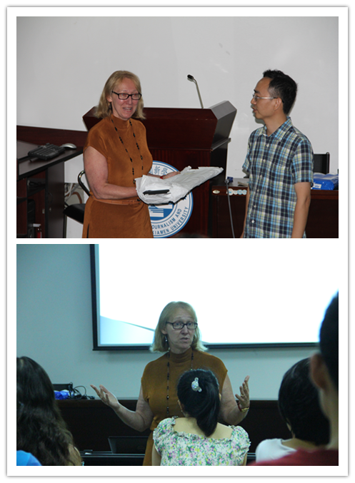 此次讲座由新闻传播学院苏俊副斌教授主持。苏老师将于下半年前往美国哥伦比亚大学进行交流访问。在讲座开始之前,Nancy老师为苏老师送上来自美国哥伦比亚大学的纪念礼品,并诚挚欢迎苏老师前往哥大。