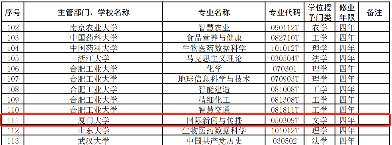 新春伊始,开学之初,厦门大学新闻传播学院收到来自教育部的喜讯。在教育部公布的2021年度普通高等学校新增的1961个专业点中,厦门大学新闻传播学院新增一备案本科专业——国际新闻与传播(专业代码050309T)。该专业也是本次备案中厦门大学唯一一个新增的专业。
