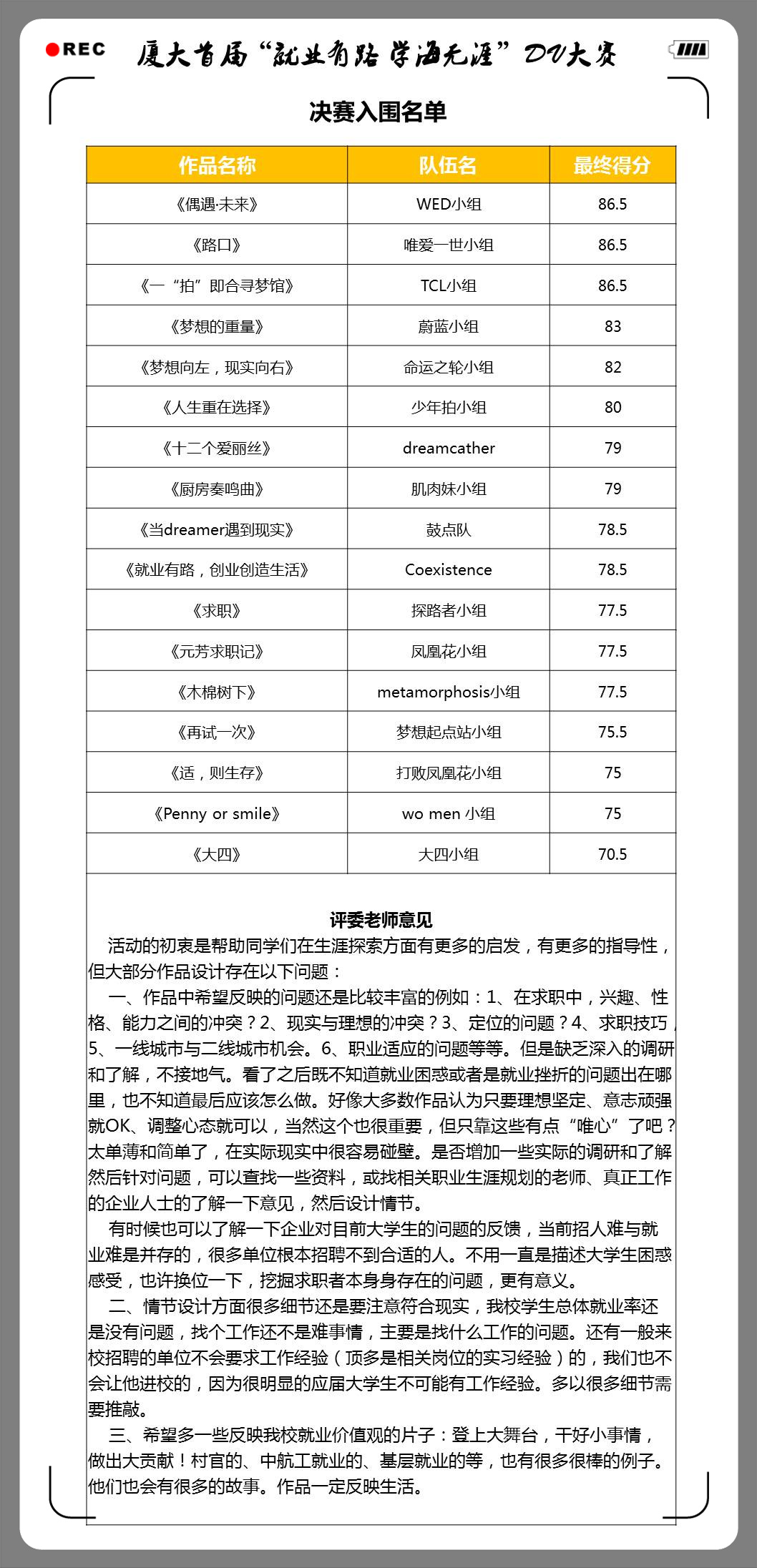 预赛作品的评判标准包括主题新颖性、事物/人物典型性、结构逻辑性、情节故事性、拍摄技术性五个主要部分,经过一周的紧张评比计分,共有18支优秀团队进入决赛。来自生命科学学院的唯爱一世小组、新闻传播学院的WED小组和TCL小组获得最高分86.5分,并列第一,来自公共卫生学院的蔚蓝小组和命运之轮小组紧随其后,分别获得83分和82分。在对参赛作品高度赞扬的基础上,赵晓慧老师也对各支队伍提出了更高要求,希望同学们能加深实践调研,反映实际问题,使作品发挥在就业与学涯探索中“传道”、“解惑”的启发作用。