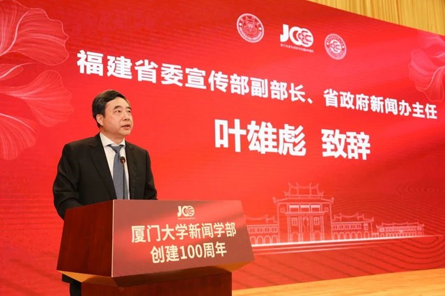 叶雄彪对厦门大学新闻学部创建100周年表示祝贺。他在致辞中充分肯定了“部校共建”以来,厦门大学新闻传播学院在学科建设、教学提升、人才培养、智库建设、科研转化等方面取得的丰硕成果。他希望厦门大学新闻传播学院始终坚持马克思主义新闻观,深入学习贯彻习近平总书记关于新闻舆论工作的重要论述,以此统领新闻教育事业和学科建设,为社会培养更多扎根中国大地、具有全球视野的全媒体复合型专业型新闻传播人才。叶雄彪表示,省委宣传部将大力支持厦门大学新闻传播学院马克思主义新闻观研究与教育中心建设,做大做强福建媒体发展研究院,为推动厦门大学新闻传播学院守正创新、执启新章提供有力支持。