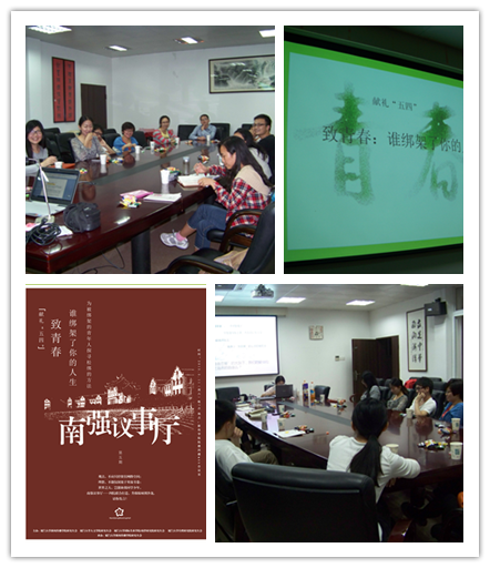 关于理想的人生,同学们从陆步轩和陈生这两位著名的北大“猪肉佬”谈起,从他们独特的“非主流”成长道路出发,思考和讨论当代年轻人如何突破狭隘成功学的局限,实事求是地选择符合自身个性特长的人生道路,树立正确的择业观、价值观和人生观。关于“�丝文化”,同学们谈到,作为时下年轻人面对压力产生的一种自嘲和发泄,“�丝文化”实质上反映了年轻人正在经历的一种精神危机;大家一致认为,身为年轻人,超越“�丝文化“,认准自己的位置,为社会尽一份责任是最重要的。在讨论新近上映的电影《致青春》时,大家认为最重要的还是影片中所讲述的关于青春的故事引人思考;80后、90后的年轻观众,可以通过影片思考自身的处境,有利于人生的抉择。