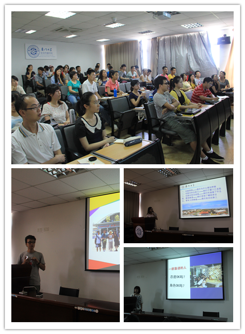 接下来,去年学院各支优秀实践队的代表依次上台发言,和在场的同学们分享了他们的实践经历和心得体会。09级本科刘诗瑶同学所在的“We Love Amoy”实践队,以“文化遗产视角下的厦门”为实践主题,对厦门地区不同时期的文化遗产进行考察,唤起人们对厦门文化遗产的认知,得到了中央电视台、《人民日报》、《厦门晚报》等多家主流媒体的关注和报道。在总结实践经验时,刘诗瑶提到,要学会将社会实践和专业实习联系起来,从兴趣出发,立足所学专业,做好青年人的探索。11级硕士张莎莎同学和大家分享了暑期社会实践“行前小贴士”。张莎莎所在的“传而有道”实践队以“海西文化创意产业与高校人才对接现状与研究”为实践主题,深入调查了厦门和泉州两地的文化创意产业和相关高校的人才培养现状,并做了有针对性的数据分析。张莎莎强调了社会实践过程中要特别注意计划的可操作性,留意交通路线和其他各方面细节,才能取得比较理想的实践效果。此外,11级本科董泽飞同学代表“For-U实践队”、10级本科陈充同学代表“西厦实践队”,分别向大家讲述了各队的实践经验,让大家受益匪浅。