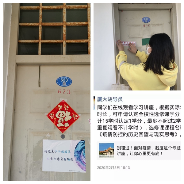 疫情防控工作小组发布《致厦门大学新闻传播学院全体师生员工的一封信》,向全体师生员工发出“切实高度重视、提高防控意识、做好卫生和健康监测、学习疫情防控知识”倡议要求,强调所有学生不得提前返校,要求师生员工自觉配合服从学校和地方政府、社区做好防控工作,不恐慌,不信谣、不传谣,共同增强防控信心决心。