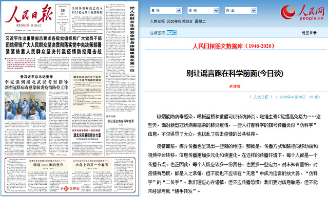 1月28日,《人民日报》头版刊发学院院长余清楚的评论文章《别让谣言跑在科学前面》,发出了厦大人“保持科学理性的态度,客观地认识疫情、科学地预防疫情、有效地防控疫情”的声音和打赢疫情防控阻击战的坚强决心。