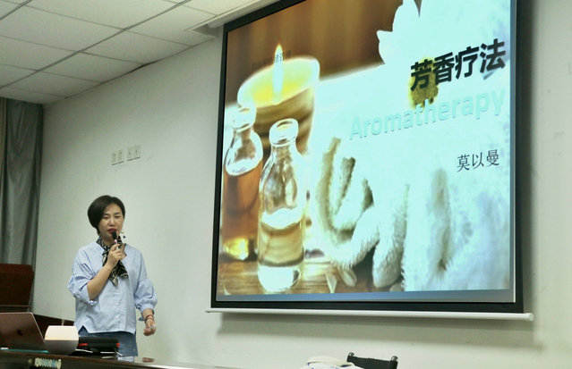 在聂老师简短介绍后,沙龙正式开始。在香薰机散发出的清甜的野橘香气中,莫以曼老师讲述了自己的个案经历,在这次经历中她发现精油的香气有时可以勾起他人的重要回忆,从而使人打开心扉,更好地释放自己的情绪,这也使她逐渐开始学习和研究精油。
