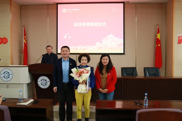 大会中,学院特别举行了赵洁老师的荣退仪式,赵洁老师在发表荣退感言中,细数在学院的点点滴滴,感念生长于伟大的时代,感谢母校厦门大学的栽培与培养,并祝愿学院在新百年新征程中取得更大的进步,祝愿老师们取得更好的成绩。广告学系主任曾秀芹向赵洁老师致感谢词,并深情回忆了赵洁老师教书育人的感人事迹以及为广告学系做出的重要贡献。曾铮书记和院工会主席迟月利代表学院向赵洁老师赠送纪念品和鲜花表示敬意和感谢。