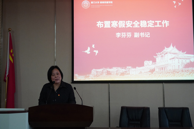 学院党委副书记李芬芬在大会上布置了学院寒假春节的安全稳定工作。李芬芬提示,要牢固树立个人是“疫情防控第一责任人”的意识,做好个人防护工作,坚持每日健康打卡,严格遵守出行审批制度等相关防控要求;要做好各类安全防范,及时排查隐患,认真做好寒假春节期间的值班值守工作;要注意网络安全,提升网络信息辨别能力,共同维护校园安全,自觉增强国家安全观。