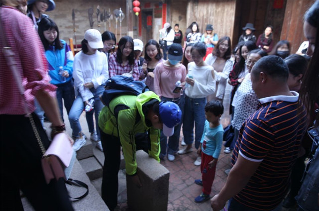 随后,研会成员们又参观了东门村、三尾村等村落,在当地领导的带领讲解之下,深入山尾村综合文化服务中心,去参观清朝嘉庆十四年武进士、官至四品御前带刀侍卫的林寅登故居。同学们跃跃欲试,试图举起武进士可以轻松举过头顶进行操练的、重达300斤的石墩。现场气氛活跃,师生在潜移默化中充分感受当地的文化底蕴与风土人情。