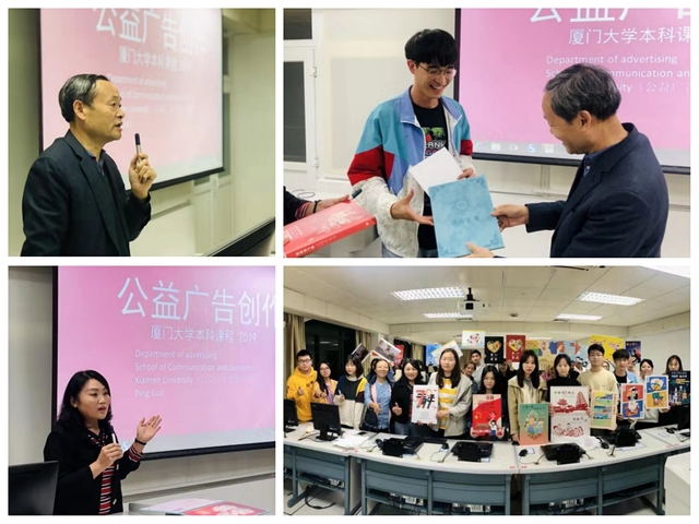 11月28日晚,在学校嘉庚主楼五号楼的《公益广告创作》课教室里,正在热烈进行着同学们的公益广告创作作品成果汇报和展示。学院领导高度重视,余清楚院长和党委副书记聂鑫老师到达现场,对同学们谆谆教诲,并为在第十一届全国大学生广告艺术大赛中获奖的同学代表颁发奖状,使得学院首次创立的《公益广告创作》课程在温馨、关爱又充溢着收获的欣喜中圆满结课。