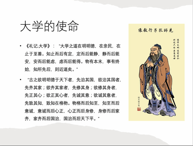 第一部分是“大学的使命”。《礼记·大学》中写道:“大学之道在明明德,在亲民,在止于至善。知止而后有定,定而后能静,静而后能安,安而后能虑,虑而后能得。物有本末,事有始终,知所先后,则近道矣。”这是古人眼中大学教育的目的和培养人才的方向。“大学”,即大人之学,古人认为通向“大人之学”的途径是:格物、致知、诚意、正心、修身、齐家、治国、平天下。而现代意义上的大学在教育学生“自我完善”的角度与古代教育一脉相承,但在其原本的要求上又增添了新的内涵。正如梅贻琦先生在《大学一解》中提出的大学教育需注重三个层面,即“知”、“情”、“志”,而后两者的意义又超乎最前者。由此可见,在大学学习中,我们不仅要努力学好专业知识,更要学会“爱”,爱自己和爱他人,而且要培养自己不畏艰难、勇于追求梦想的意志品质,树立“为吾国放一异彩”的崇高理想。