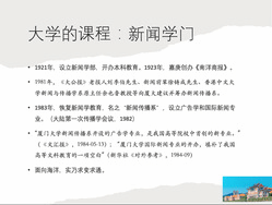 第二部分是“大学课程:新闻学门”。新闻学,为匡扶正义之学,是现代社会之公器,此语道出了“新闻”之于社会发展的重要性以及“新闻学”课程开设的意义所在。1921年,厦门大学新闻学部应时代之需而办,成为中国新闻学教育的“先行者”,这一点令无数厦大新闻学子引以为豪。明年,就是厦门大学新闻学部成立一百周年,我们将有幸见证这一光荣而意义非凡的历史时刻,可谓满怀期待而又觉重任在肩。接下来,苏老师又向我们介绍了新闻学、广播电视学和国际新闻与传播这几个专业的研究内容和培养方向,使我们对未来的学业规划有了更进一步的思考。