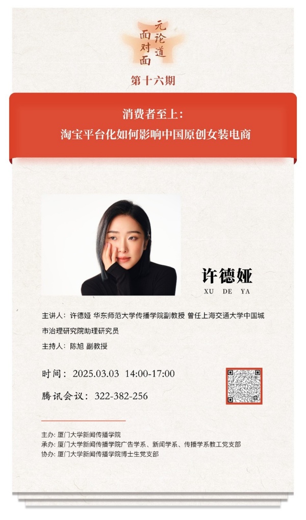 3月3日,由厦门大学新闻传播学院主办、厦门大学新闻传播学院广告学系、新闻学系、传播学系教工党支部、厦门大学新闻传播学院博士生党支部承办的“元论道·面对面”青年学术沙龙第16期线上讲座成功举办。本次讲座题以《消费者至上:淘宝平台化如何影响中国原创女装电商》为题,由华东师范大学传播学院许德娅副教授主讲,陈旭副教授主持,80余位师生参会。