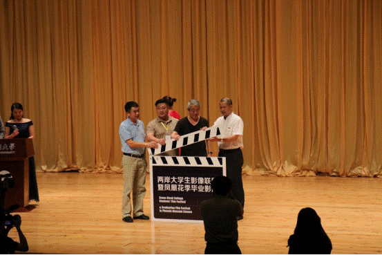 致辞结束后,厦门大学党委副书记林东伟、台湾政治大学广播电视学系郭力昕老师、吉林师范大学王军华老师、厦门大学新闻传播学院党委书记郑树东上台启动本届两岸大学生影像联展暨凤凰花季毕业影展开幕仪式。