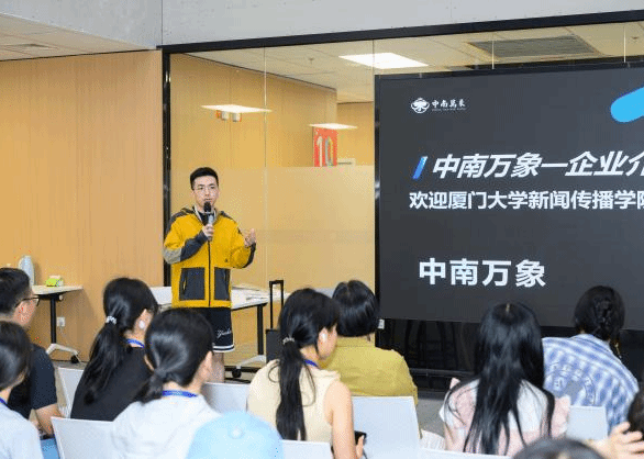 在正式活动中,中南万象组织部负责人陈天向参访师生详细介绍了公司的业务布局、团队架构、发展历程及人才培养体系。随后圆桌座谈环节,在该企业实习生、厦大新闻传播学院2021级本科生罗怡文的主持下,中南万象组织部负责人陈天、高级合伙人黄欣、人才发展策略专家左璟辰等三位企业管理层及资深员工受邀出席,与参访师生展开深度对话。各企业嘉宾结合自身职业经历,围绕职业选择、面试技巧、员工成长晋升通道、职场社交及工作生活平衡等学生关注的话题逐一解答,为同学们带来了极具实用性的职场与成长经验分享。