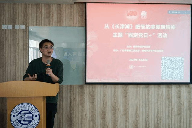 来自广告学系教职工党支部的宣长春和苏文分别做题为《新时代的文化自信和国际传播的可能路径》与《从〈长津湖〉的观影所感谈新时代高校爱国主义教育的必要性》的分享。两位老师结合广告学专业,从文化传播视角解读抗美援朝精神的传承与传播;阐释了树立正确的战争观、文化观和党史观,从“悟”到“为”学习历史、走进英雄,加强爱国主义教育,构建文化自信的重要性;强调我们每个人都是国家文化软实力国际传播的推广者。