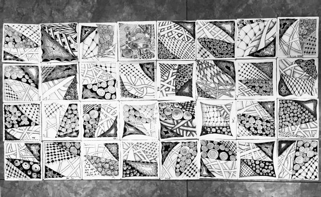 一段介绍后,李颖老师开始正式带领大家绘制禅绕画。完成一幅缠绕画,只需8个步骤。首先,老师让同学们怀着感恩与欣赏的心去触摸纸砖,用手感受它的纹路、厚度、柔软度,把未知的期待融入到这张纸中。第二步是在纸的四个角描点,再用线连接四个点形成边框。这个边框可直可曲,可固定也可逾越,因为画禅绕画的过程没有对错,一切都忠于内心所想。之后是用“Z”字形划分出四个画图的区域,给每个区域画上不同的图样。老师先示范,再由同学们按步骤完成自己的画作,虽然大家用的是同一个图样,但是每个人画出来的样子都不尽相同,都包含着自己内心的想法与构思。在禅绕画中,没有像与不像、好与不好之分,就如同李老师所说,每个人的画都像自己的生活一样,是独一无二的。在完成图样和阴影并写好姓名后,便是各自欣赏自己的作品。最后在同学们都完成了绘画后,老师将大家的作品拼在一起,形成了一幅独特的艺术作品。