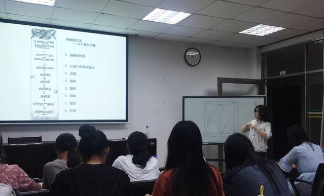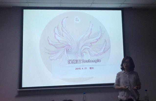 在聂老师简短介绍后,沙龙正式开始。李颖老师首先向大家介绍了禅绕画的相关知识。禅绕画最早是由美国的一对夫妻创造的。妻子是一位字体艺术家,丈夫则做过17年的僧侣。因此,二人各自的经历和专业碰撞在一起,灵感迸发便产生了禅绕画。它的画法很简单,无需绘画基础,只需通过绘画不断重复和变化的点和线等元素,加之以阴影或色彩,便可以创造出各式各样的作品。而在绘画的过程中,绘画者可以通过不断的变化和重复发现无限的可能性,并从中体会到放松和愉悦。