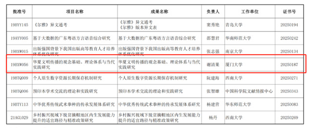 2025年2月6日,全国哲学社会科学工作办公室网站公布了2025年1月国家社科基金年度项目结项情况。其中,由厦门大学谢清果教授负责的《华夏文明传播的观念基础、理论体系与当代实践研究》课题荣获2025年1月国家社科基金年度项目优秀结项。这一荣誉不仅是对谢清果教授及其团队4年来辛勤耕耘的肯定,也标志着华夏文明传播研究领域的重要突破与突出贡献。