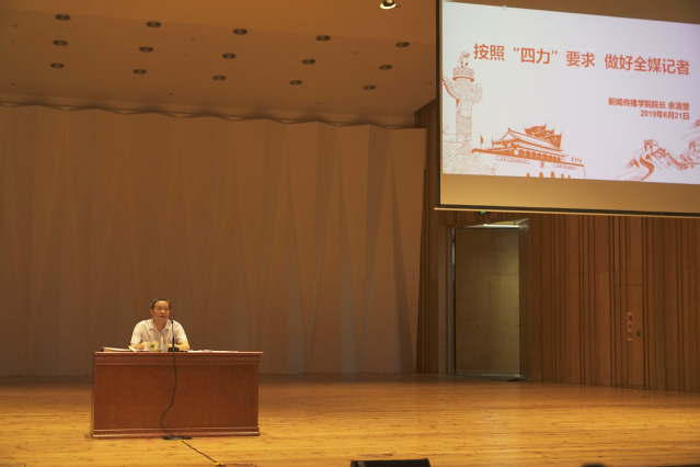 6月21日下午,新闻传播学院院长余清楚在科学艺术中心音乐厅为全院师生作题为“按照‘四力’要求,做好全媒记者”的讲座。