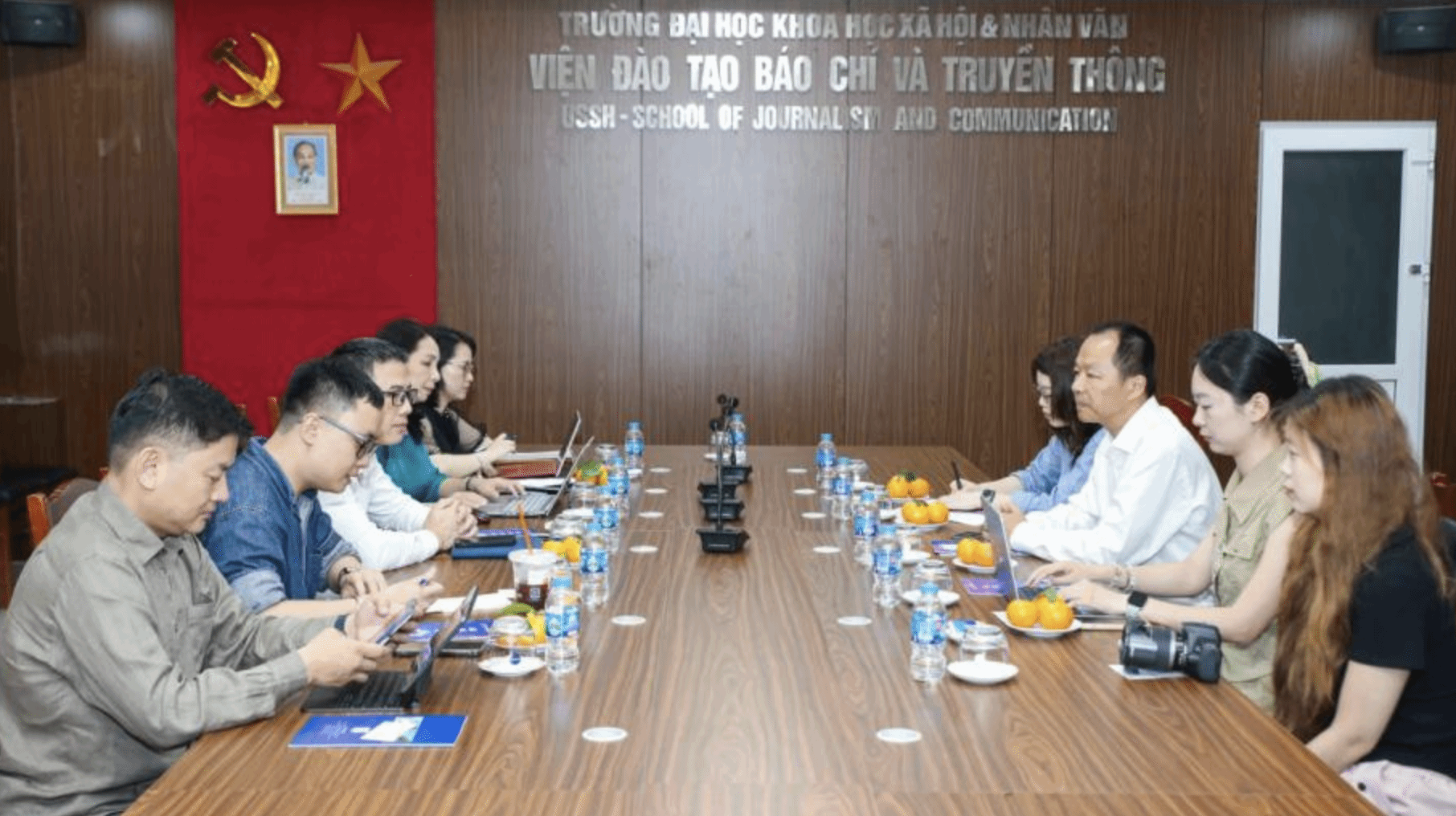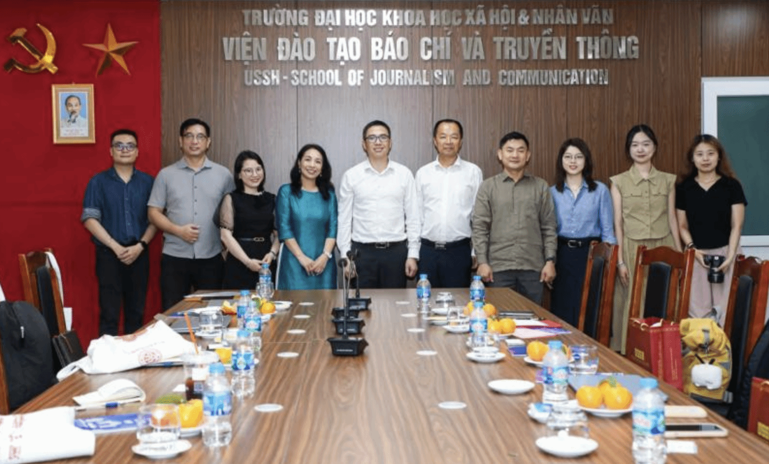 4月28日上午,越南河内国家大学下属人文与社会科学大学新闻与传播学院院长PHAN VAN KIEN(潘文坚博士)等热情接待我院代表团,双方举行了一场热烈融洽的合作洽谈会。双方就新闻传播学科建设、师生交流及科研项目共建等议题展开深入探讨,达成多项合作共识,计划通过论坛、互访、出版等项目深化中越高校间的文化交流和学术合作。