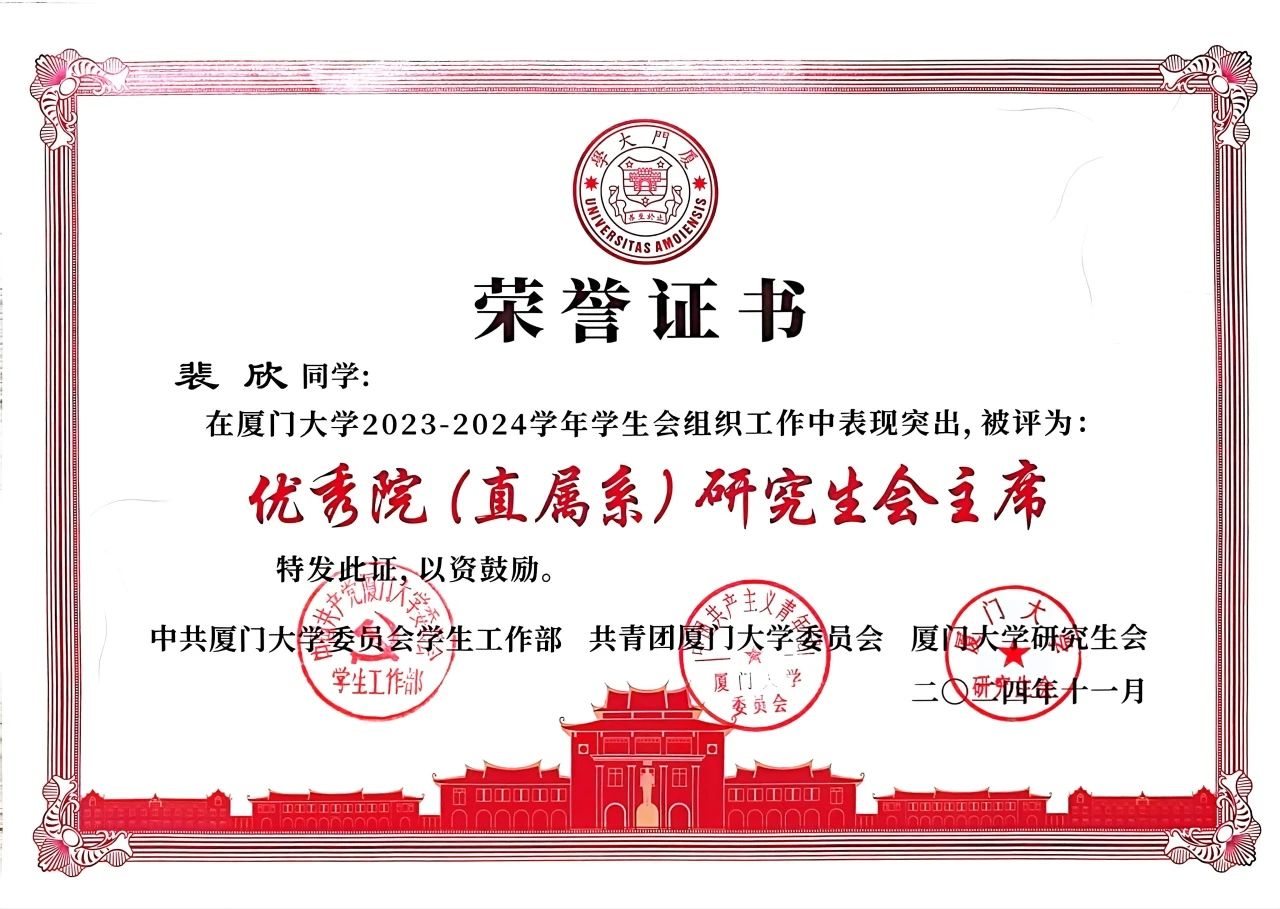 为树立典型、鼓励先进,更好地推动全校学生会组织工作开展,学校于2024年9-10月开展厦门大学2023-2024学年二级学生会、研究生会述职评议工作。新闻传播学院研究生会荣获厦门大学2023-2024学年“优秀院(直属系)研究生会”荣誉称号,新闻传播学院研究生会执行主席裴欣荣获厦门大学2023-2024学年“优秀院(直属系)研究生会主席”荣誉称号。