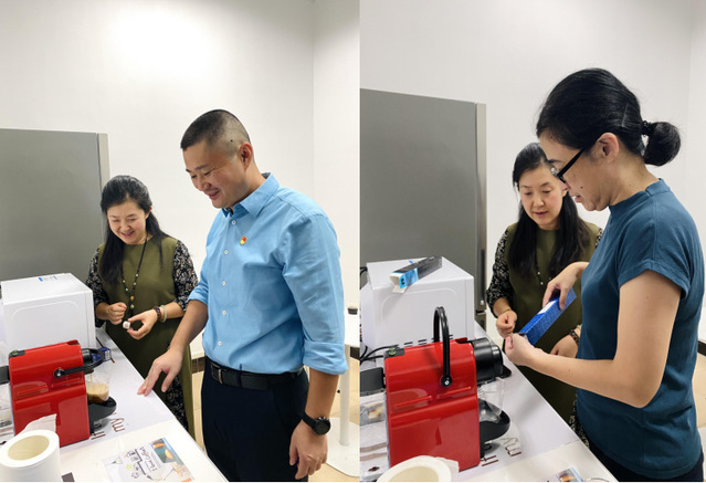在现场,迟月利老师还贴心地为前来参观的老师们现场冲泡咖啡。咖啡入口,先是溢满口腔的苦涩,随着时间的推移又逐渐感受到一丝回甘,一种温暖的气氛在师生之间传递。循着香气,又有几位老师颇有兴致地加入咖啡室的热闹当中。面对这精致的咖啡机,许多老师也跃跃欲试,纷纷上前在指导下试用。曾铮书记还提出,应当制作简单易懂的使用教程附在咖啡机旁,方便师生们使用。