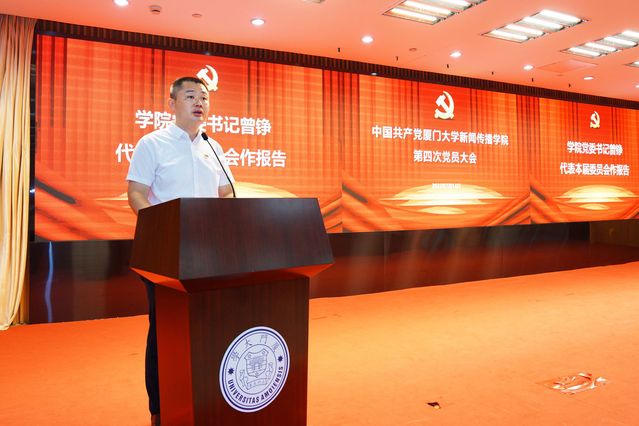 院党委书记曾铮代表中共厦门大学新闻传播学院第三届委员会向大会作题为《守正创新,凝心聚力,为建设中国特色、世界一流新闻传播学院奋勇前进》的工作报告。报告共分三个部分:一、过去四年的主要工作和事业发展成就;二、奋进新百年,开启新征程;三、发挥“三海”学科特色,谱写学院发展新篇章。