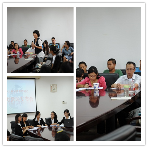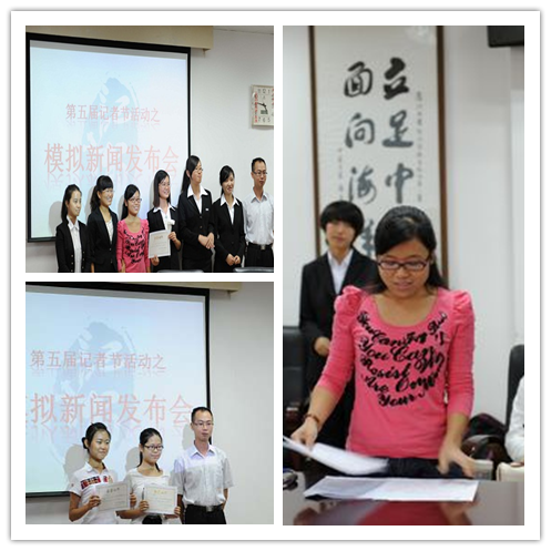 为加强同学们对新闻学和传播学专业的理解,为同学们提供了一个体验发布会情境,了解新闻传播专业特点的机会和平台,鼓励理论与实践的有机结合,10月27日下午,由厦门大学党委宣传部、共青团厦门大学委员会和厦门大学新闻传播学院共同主办的厦门大学第五届记者节系列活动之模拟新闻发布会在新闻传播学院会议室举行。新闻传播学院11级本科生史丽丝、12级本科生周晓杰同学荣获“最佳记者奖”,新闻传播学院林娜等五位同学荣获“最佳发言人团队奖”。