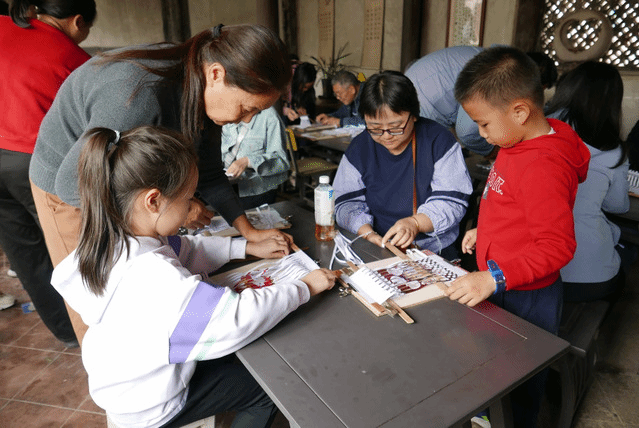 随后,我们来到了位于永春县吾峰镇侯龙村的侯龙书院,这是永春县仅存的仍保护完好的古代书院。2002年1月,侯龙书院被列为县第四批文物保护单位。2016年,侯龙书院荣获“第一批福建省水文化遗产”称号。2018年10月,它被列为福建省第九批文物保护单位。书院由竹园斋和桂轩两书斋构成,已有300年的历史。通过导游的介绍,我们了解了园林式书院的历史和独特的文化价值,并了解了侯龙陈氏的族谱。在书院中,大家积极投入对于永春非遗纸织画的制作当中,在师傅的指导下,大家埋下头认真地制作,在手工实践中感受中国传统文化的魅力,看着自制的纸织画完成后装裱入框,大家满心欢喜,收获满满。