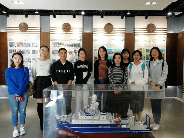 (2017级新闻学传播学硕士党支部成员在嘉庚号模型前合影留念)