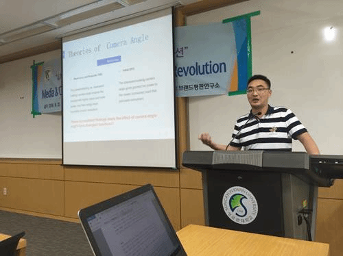 8月22日下午,中韩广告学术研讨会继续在成均馆大学国际馆内进行,宣长春博士生发表了题为“广告中的拍摄角度问题”的演讲,来自韩方的教授和博士针对感兴趣的问题进行了提问和交流,并给出了宝贵的建议。