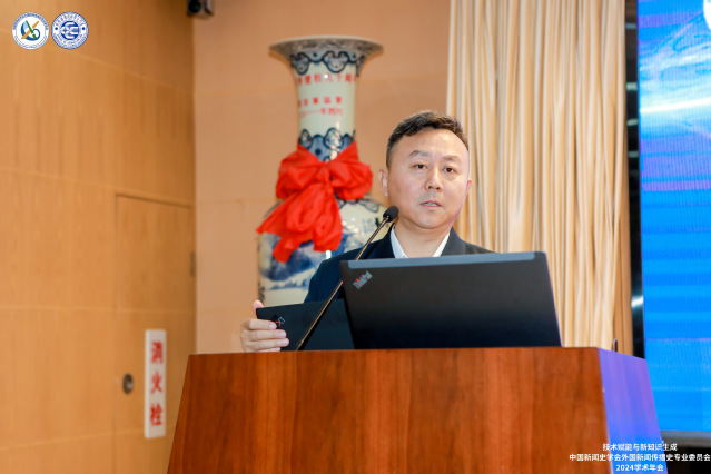中国新闻史学会外国新闻传播史专业委员会理事长、中国社会科学院大学党委常委、副校长姜飞教授致辞。他强调应该从历史性、学术性、政治性三个维度理解习近平总书记提出的“文明交流互鉴”与“全球文明倡议”,并以此为主轴推动新知识生产与外国新闻传播史专业委员会的发展。