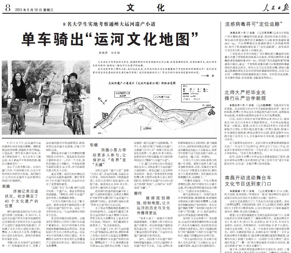 9月18日的《人民日报》第八版“文化”栏目及9月13日新华网分别以《8名大学生实地考察通州大运河遗产小道―单车骑出运河文化地图》、《中国大学生骑车探查大运河文化遗产》为题,报道了由来自厦门大学新闻传播学院和中国传媒大学、山东大学、安徽大学的8位本科生和研究生共同组成的暑期社会实践队在“大运河遗产小道”北京通州段和白浮泉段,用骑行的方式收集运河沿岸的道路情况、路标设置以及沿途文化景观,制作有关京杭大运河的“文化遗产地图”的相关活动,以运河为链条挖掘保护中华文化遗产,彰显当代大学生责任意识。