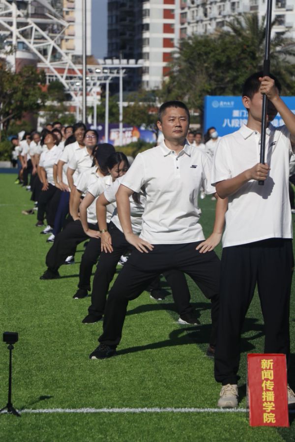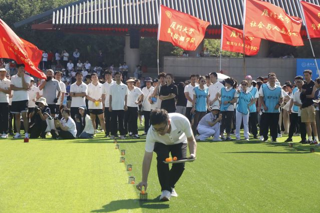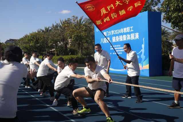 秋日迟迟,绿意阑珊。11月17日上午,厦门大学2024年教职工八段锦、健身操集体展演和趣味运动会在演武田径场举行。学院教师代表在运动场上挥洒汗水,展现出我院团结拼搏、乐观向上的活力风采。本次运动会精心设置了集体跳绳、拔河比赛、抢收抢种和同心击鼓四个项目。这些项目独具匠心,独特新颖且趣味十足,完美地将运动性、竞赛性与趣味性融合在一起。