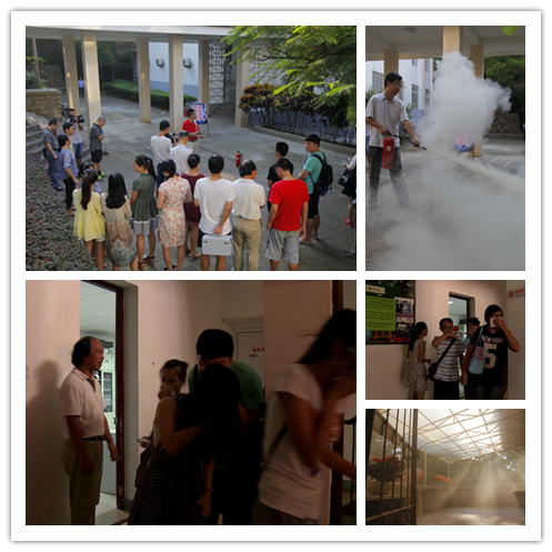 下午四点一刻,工作人员点燃事先准备好的模拟烟雾弹,新闻实验楼一楼平台及二楼阳台随即冒起红棕色的浓烟。实验楼安全警报系统第一时间启动,警报声在楼道和各教室响起。警报声中,各间教室的师生迅速反应:老师们引导学生有序撤离“火场”,并不时提醒同学们,低头弯腰,捂住口鼻,躲避浓烟;同学们按照指引,迅速地沿安全通道撤离“火灾现场”,及时疏散到户外安全位置。接着,孙俊逸为师生们详细讲解了各型常用灭火器的工作原理和使用规范,并现场为大家演示了干粉灭火器的操作要领。随后,张劲对此次演练进行了点评。他认为,此次演练达到了锻炼火场逃生实战技能的目的,很成功,“遇到火灾时要冷静应对,正确处理。有时候一个小小的技能就能挽救人的生命。”张劲还提醒同学们,除了消防安全,在日常生活中还要有意识地培养其他诸多方面的安全防范意识。