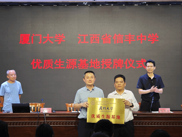 厦门大学新闻传播学院党委书记曾铮向信丰中学介绍了优质生源基地建设情况和厦门大学基本情况,并鼓励信丰中学学子积极报考厦门大学;信丰中学党委副书记、校长肖德胜对厦门大学把优质生源基地授予信丰中学表示感谢。在双方的见证下,曾铮书记代表厦门大学向信丰中学授予“厦门大学优质生源基地”牌匾。