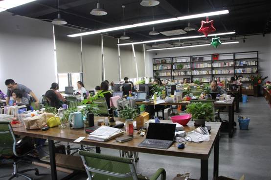 师生们首先参观了办公场所。办公室不大,没有格子间,而是摆放着几张长条行的桌子,每张桌子上都摆着绿植,同事们相邻而坐。此外,场地布置也文艺温馨,有一面墙上钉满了书架,摆放着很多书,而在书架旁边还有一个小舞台和小厨房。新传院友、公司员工许杨彬介绍说,开放的办公空间,没有隔间的办公桌都方便同事们直接交流,员工们感情都很好,他们不止是工作中的同事,更是生活中的朋友。