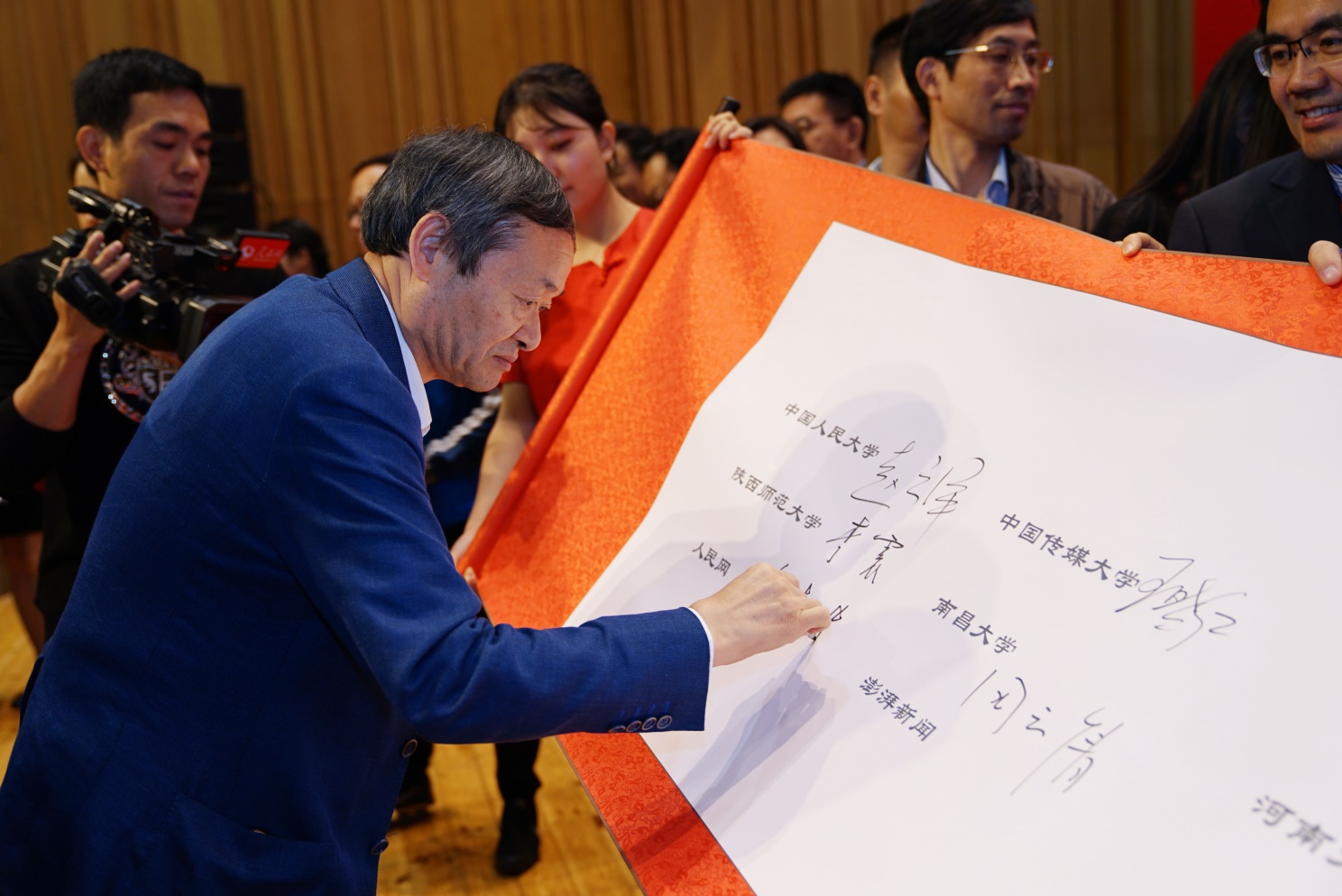 开幕式及主论坛的最后一项议程是人民网奖学金项目新增院校启动仪式。此次新增的院校包括陕西师范大学新闻与传播学院、中山大学传播与设计学院、四川大学文学与新闻学院。陕西师范大学新闻与传播学院院长李震作为新增院校领导代表致辞。人民网总编辑、余清楚院长与三位学院代表进行了签约仪式。开幕式及主论坛到此圆满成功。
