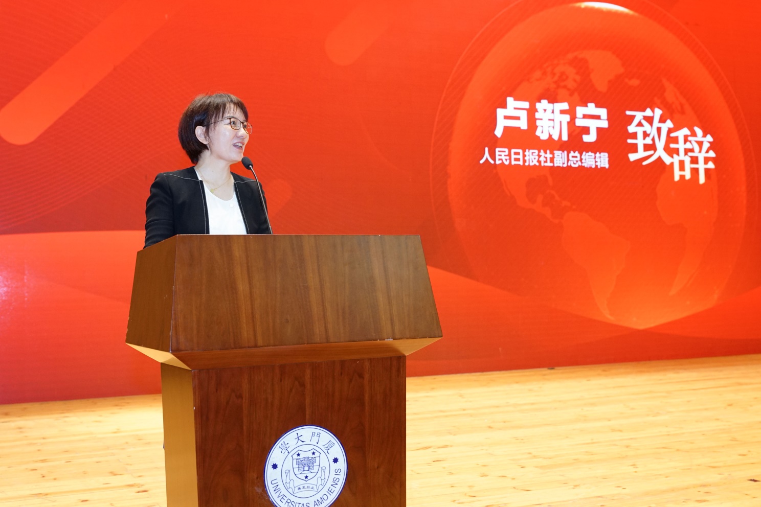 卢总首先回顾了人民日报与厦门大学之间的联系。随后,她又梳理了新闻传播、思想宣传与共产主义理想、马克思主义学说之间的紧密联系。在卢总看来,新闻传播学院是培养新闻人才最主要的基地。她认为,在新时代背景下,如何守正创新,培养让党和人民放心的新闻传播事业的接班人,是我们应该高度重视的时代课题。关于新时代新闻事业的发展,她分享了四点意见:一是要守正固本,坚持马克思主义新闻观。二是要强化担当,增强新闻工作者的责任意识。三是要深入实践,提高新闻工作者的脚力、眼力、脑力和笔力。四是要拥抱创新,适应时代变革,把“最大变量”转化为“最大增量”。