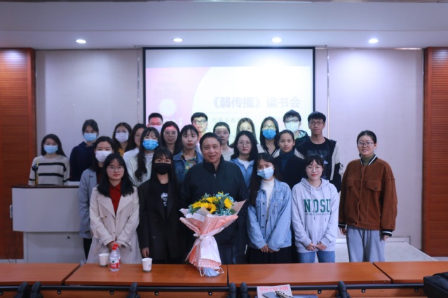 读书会结束后,同学们的学习交流热情尚未退怯,有的同学自备花束献给老师以示感谢,有的同学拿着书带着笔,请老师在《弱传播》书上签名留念,有的同学则围着老师继续讨论……读书会在师生合影中落下帷幕,邹老师的教导深入同学们心中,引导同学们在未来路上继续探求知识和增长智慧。