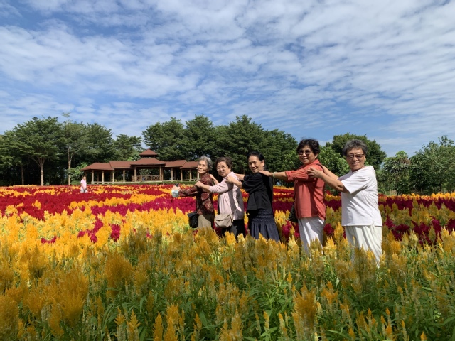 最适合拍照的地点就是园博苑海洋岛的凤尾花花海,老师们在这里拍照合影,笑颜如花。