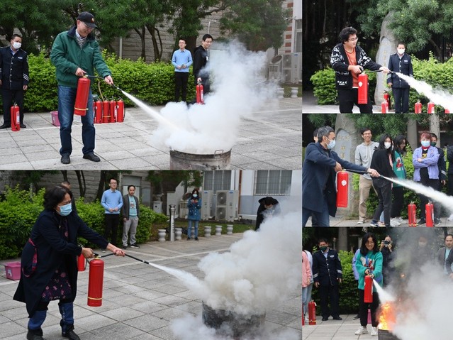 经过初步培训,师生们轮流上阵,亲自体验灭火器的实操演练。演练中,因不熟悉使用灭火器,一些实操者未能准确判断风向与把握安全距离,无法快速熄灭火焰;使用时未拔除安全插销;身体过于靠近火源而受到浓烟影响。在保卫处老师及工作人员的耐心指导下,实操师生学会了“提、摇、拔、握、扫、压”的操作流程,成功使用灭火器熄灭火焰。