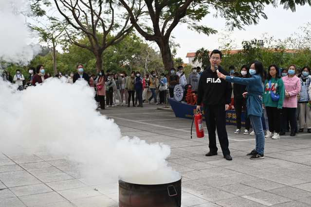 孙俊逸在广场讲解干粉灭火器的使用方法与注意事项,在示范安全灭火规范动作后,他列举部分发生在校园内火灾事故典型案例,提醒师生高度重视消防安全工作。