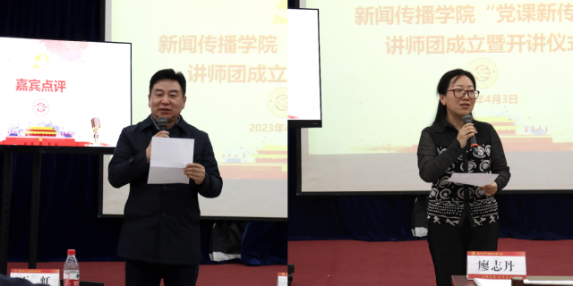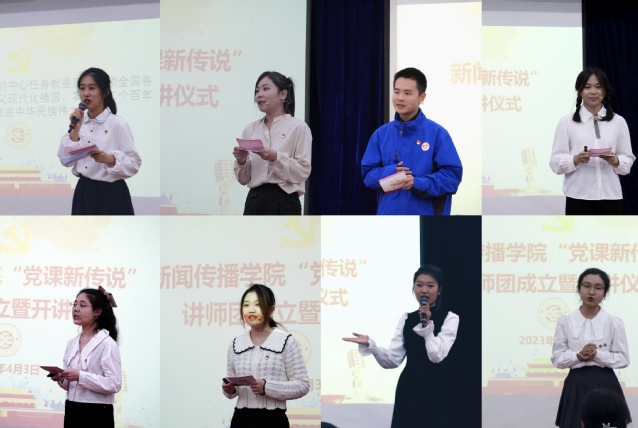 为深入学习贯彻习近平新时代中国特色社会主义思想、党的二十大精神和马克思主义新闻观,通过“新传人”的视角和声音,让党的创新理论进学生党团组织、进社团、进课堂,形成“人人讲党课、处处是党课”的浓厚氛围,新闻传播学院特别策划“党课新传说”学生党建特色活动。4月3日,新闻传播学院“党课新传说”青年讲师团成立暨开讲仪式在自钦楼二楼多功能厅举行。校关工委常务副主任赖虹凯,校党委组织部副部长、党建办主任廖志丹,教师工作部副部长伍伟平,学生工作部副部长许美霞,教务处副处长、美育与通识教育中心副主任楼红英,校团委挂职副书记晏振宇,艺术学院教授王虹,新闻传播学院党委书记曾铮,院党委副书记李芬芬、黄辉,院党委委员、工会主席迟月利,传播学系副主任史冬冬等参加活动。本次活动由新闻传播学院党委主办,“马新班”先锋党支部承办,新闻传播学院2021级本科生、“马新班”第六期学员彭轻梦主持。